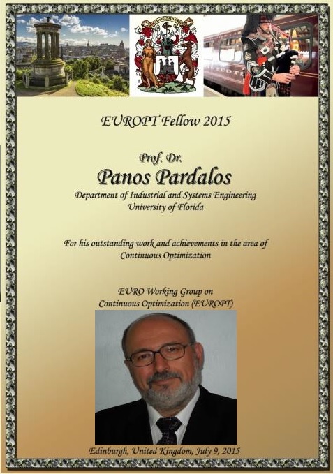 Dr. Panos Pardalos was awarded the EUROPT Fellow for his outstanding work and achievements in the area of continuous optimization. He was awarded this honor at the 13th EUROPT Workshop on Advances in Continuous Optimization (July 8-10, 2015 in Edinburgh). http://www.maths.ed.ac.uk/hall/EUROPT15